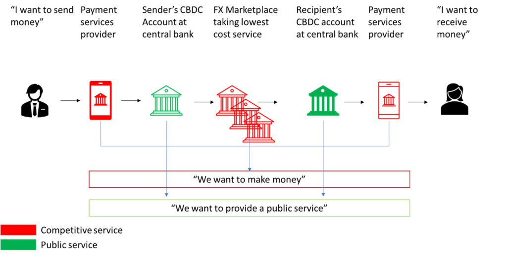 - Central banks can design CBDCs in a way that allows for competition facing the user i.e. multiple payment service providers competing to be the front-end onto your CBDC account at the central bank – perhaps even with a mandated ‘free tier’. Similarly, central banks can mandate competition and in the middle by allowing a marketplace of FX providers each competing to provide you with the lowest cost option.